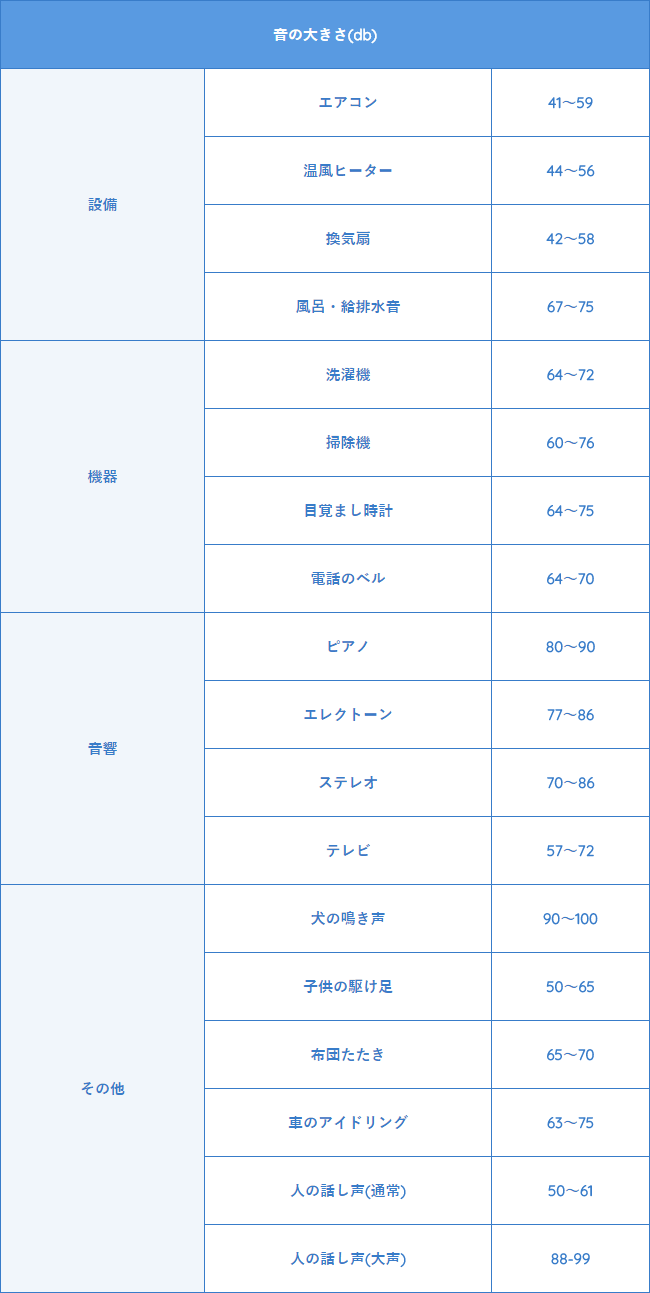 これによると人の話し声が通常で50~61db、大声だと88~99db、子供の駆け足が50~65db、洗濯機が64~72dbで意外と数値が大きいことが分かります。この数値が直ちに反映されるわけではなく、隣に音がどれだけ届いているかによって判断されるため、夜は話すこともままならないわけではないのでご注意ください。